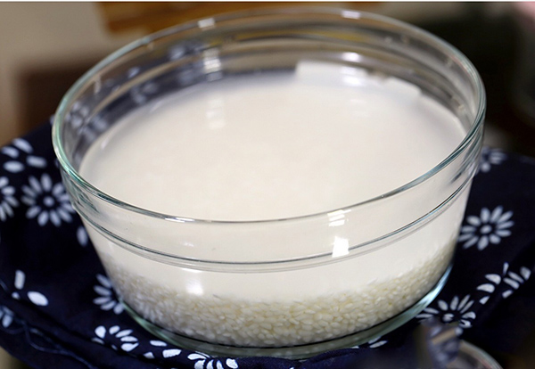 1 浸泡:選用優(yōu)質(zhì)的糯米或大米挑揀米中雜物根據(jù)發(fā)酵容器的大小和酒曲的發(fā)酵用米量來(lái)決定做米酒的多少。一般一袋力克甜酒曲一次可做4-5斤米。糯米浸泡12-16小時(shí),至可以用手捏碎即可。
