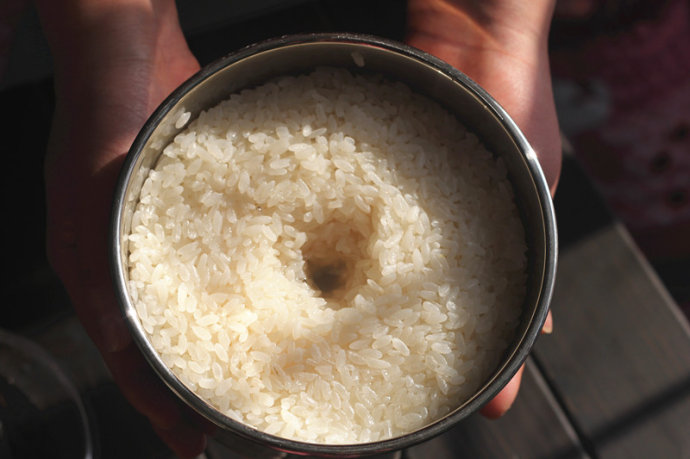 3 拌曲:米蒸至20分鐘后斷火,這時(shí)蒸出的米飯軟硬適中、米粒松散,不相互緊密粘連,開(kāi)蓋后及時(shí)將蒸好的米飯撈出放入準(zhǔn)備好的盆中并用筷子不停撥散,讓米飯中熱氣釋放掉,可適當(dāng)撒些冷開(kāi)水,既冷卻又讓米粒松散,待米飯冷卻至30度時(shí)(夏天用手試溫感覺(jué)稍涼,冬天感覺(jué)暖和不燙手即可)。把先準(zhǔn)備好的甜酒曲均勻撒在米飯上,并攪拌均勻后,放入盆中壓平整、壓結(jié)實(shí),在米飯的中心部位掏一個(gè)酒窩便于觀察發(fā)酵的變化。